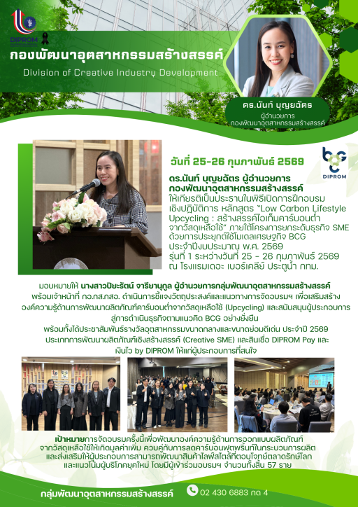 พิธีเปิดการฝึกอบรมเชิงปฏิบัติการ หลักสูตร "Low Carbon Lifestyle Upcycling: สร้างสรรค์ไอเท็มคาร์บอนต่ำจากวัสดุเหลือใช้" ภายใต้โครงการยกระดับธุรกิจ SME ด้วยการประยุกต์ใช้โมเดลเศรษฐกิจ BCG