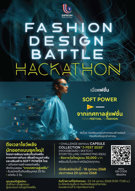 ขอเชิญนักออกแบบร่วมประชันไอเดียสร้างสรรค์ในกิจกรรม “Fashion Design Battle Hackathon” โครงการพัฒนาผลิตภัณฑ์แฟชั่นจากเทศกาลกินเจ เพื่อสร้างมูลค่าเพิ่มและเสริมสร้าง Soft Power ไทย
