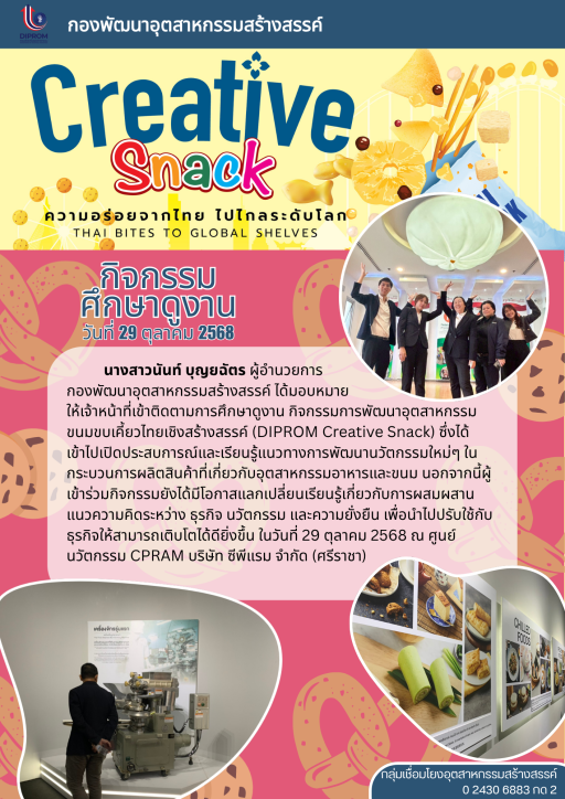 เจ้าหน้าที่เข้าติดตามการศึกษาดูงานกิจกรรมการพัฒนาอุตสาหกรรมขนมขบเคี้ยวไทยเชิงสร้างสรรค์ (DIPROM Creative Snack)