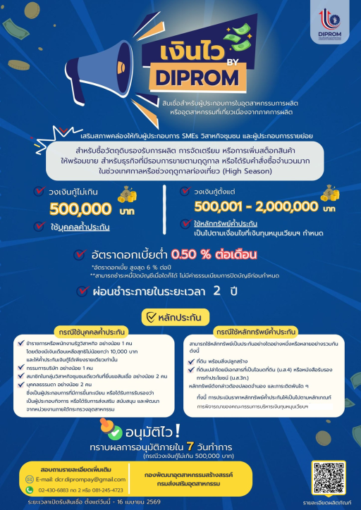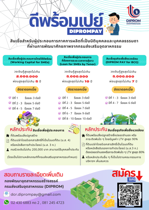 “DIPROM PAY” สินเชื่อเพื่อพัฒนา SMEs ดอกเบี้ยต่ำ เริ่มต้นเพียง 3% ต่อปี