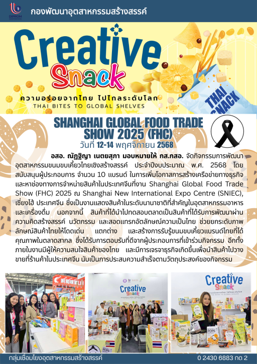 กิจกรรมการพัฒนาอุตสาหกรรมขนมขบเคี้ยวไทยเชิงสร้างสรรค์ สนับสนุนผู้ประกอบการในการเพิ่มโอกาสการสร้างเครือข่ายทางธุรกิจ และหาช่องทางการจำหน่ายสินค้าในประเทศจีนที่งาน Shanghai Global Food Trade Show (FHC) 2025