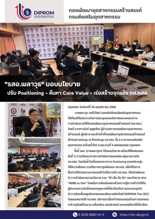 รสอ.พลาวุธ วงศ์วิวัฒน์ เป็นประธานในการประชุมมอบนโยบายและมอบแนวทางการดำเนินงานให้กับกองพัฒนาอุตสาหกรรมสร้างสรรค์