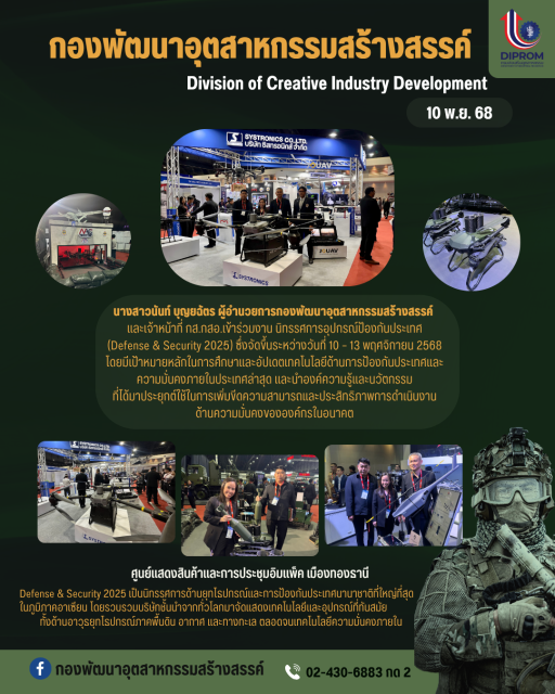 กองพัฒนาอุตสาหกรรมสร้างสรรค์ เข้าร่วมงานนิทรรศการอุปกรณ์ป้องกันประเทศ (Defense & Secunty 2025) ณ ศูนย์แสดงสินค้าและการประชุมอิมแพ็ค เมืองทองรานี