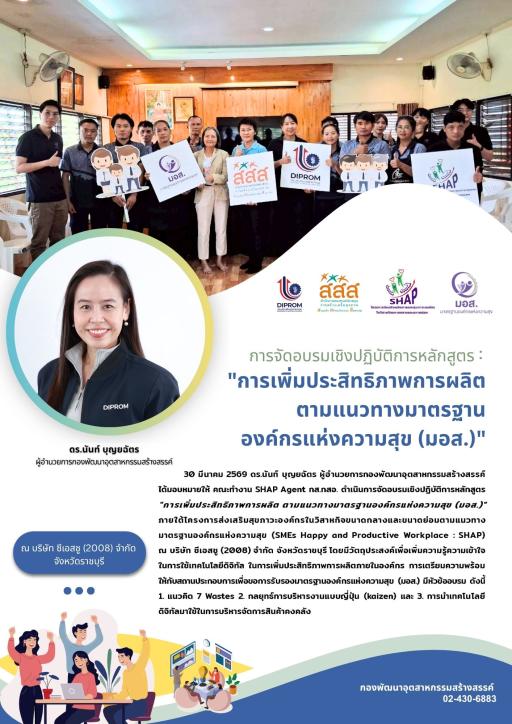 ดร.นันท์ บุญยฉัตร ผู้อำนวยการกองพัฒนาอุตสาหกรรมสร้างสรรค์ มอบหมายให้ คณะทำงาน SHAP Agent กส.กสอ. ดำเนินการจัดอบรมเชิงปฏิบัติการในหลักสูตร "การเพิ่มประสิทธิภาพการผลิต ตามแนวทางมาตรฐานองค์กรแห่งความสุข (มอส.)"