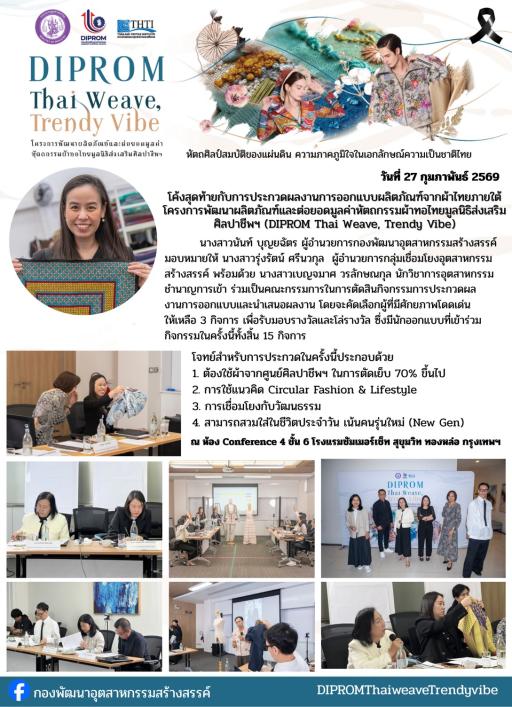 ดร.นันท์ บุญยฉัตร ผู้อำนวยการกองพัฒนาอุตสาหกรรมสร้างสรรค์ มอบหมายให้เจ้าหน้าที่ เข้าร่วมเป็นคณะกรรมการในการตัดสินกิจกรรมพัฒนาผลิตภัณฑ์และต่อยอดมูลค่าหัตถกรรมผ้าทอไทยมูลนิธิส่งเสริมศิลปาชีพฯ