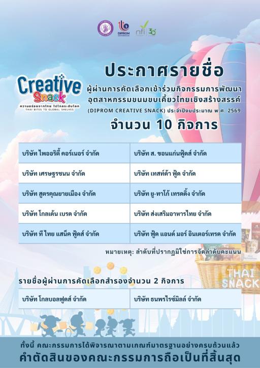 ประกาศรายชื่อผู้ผ่านการคัดเลือกเข้าร่วมกิจกรรมการพัฒนาอุตสาหกรรมขนมขบเคี้ยวไทยเชิงสร้างสรรค์ (DIPROM Creative Snack) ประจำปีงบประมาณ พ.ศ. 2569