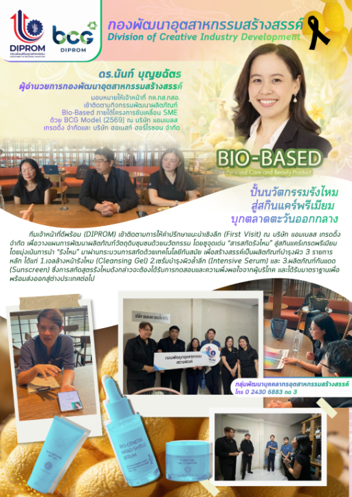 ดร.นันท์ บุญยฉัตร ผู้อำนวยการกองพัฒนาอุตสาหกรรมสร้างสรรค์ มอบหมายให้เจ้าหน้าที่ กค.กส.กสอ. เข้าติดตามกิจกรรมพัฒนาผลิตภัณฑ์ Bio-Based ภายใต้โครงการขับเคลื่อน SME ด้วย BCG Model